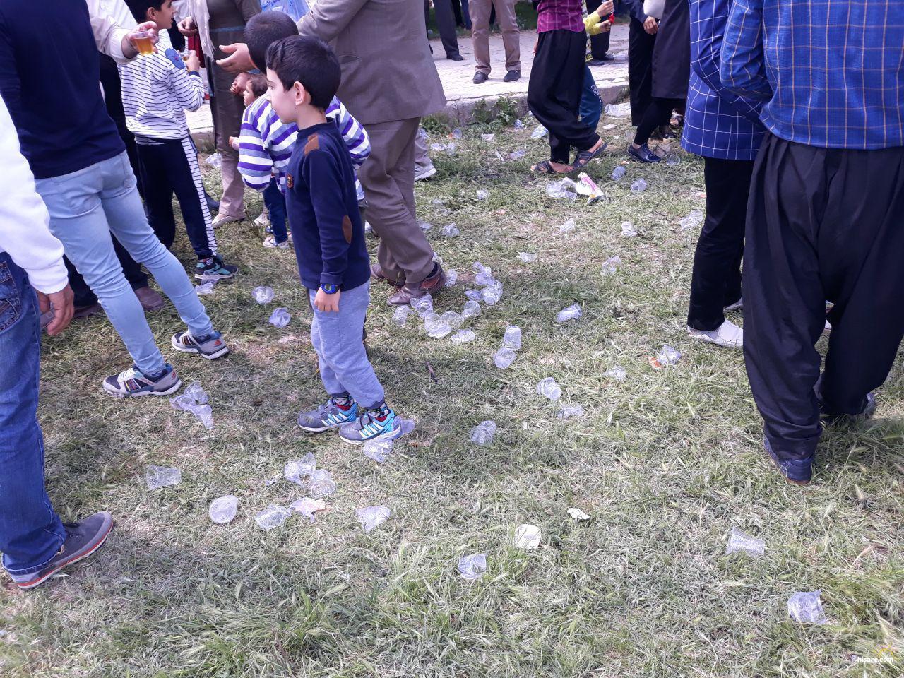 متاسفانه در جای جای مراسم ظروف یکبار مصرف ریخته شده روی زمین خودنمایی میکند ودر یک مراسم فرهنگی این مساله چشمهای هر بیننده ای را آزار میدهد ومردم همچون درختان راست قامت جلوی وانتی که شربت تقسیم میکندبه پا خواسته اند.